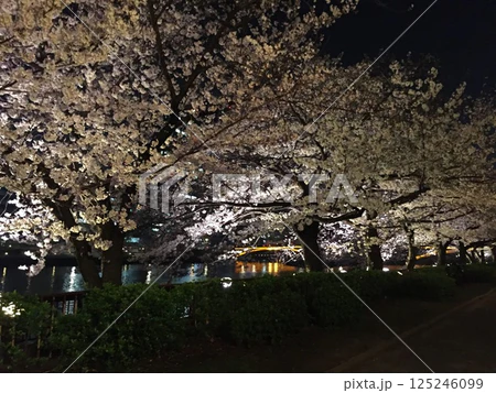 ・Title:・タイトル:夜桜と川辺の灯り / Cherry blossoms by the river at night